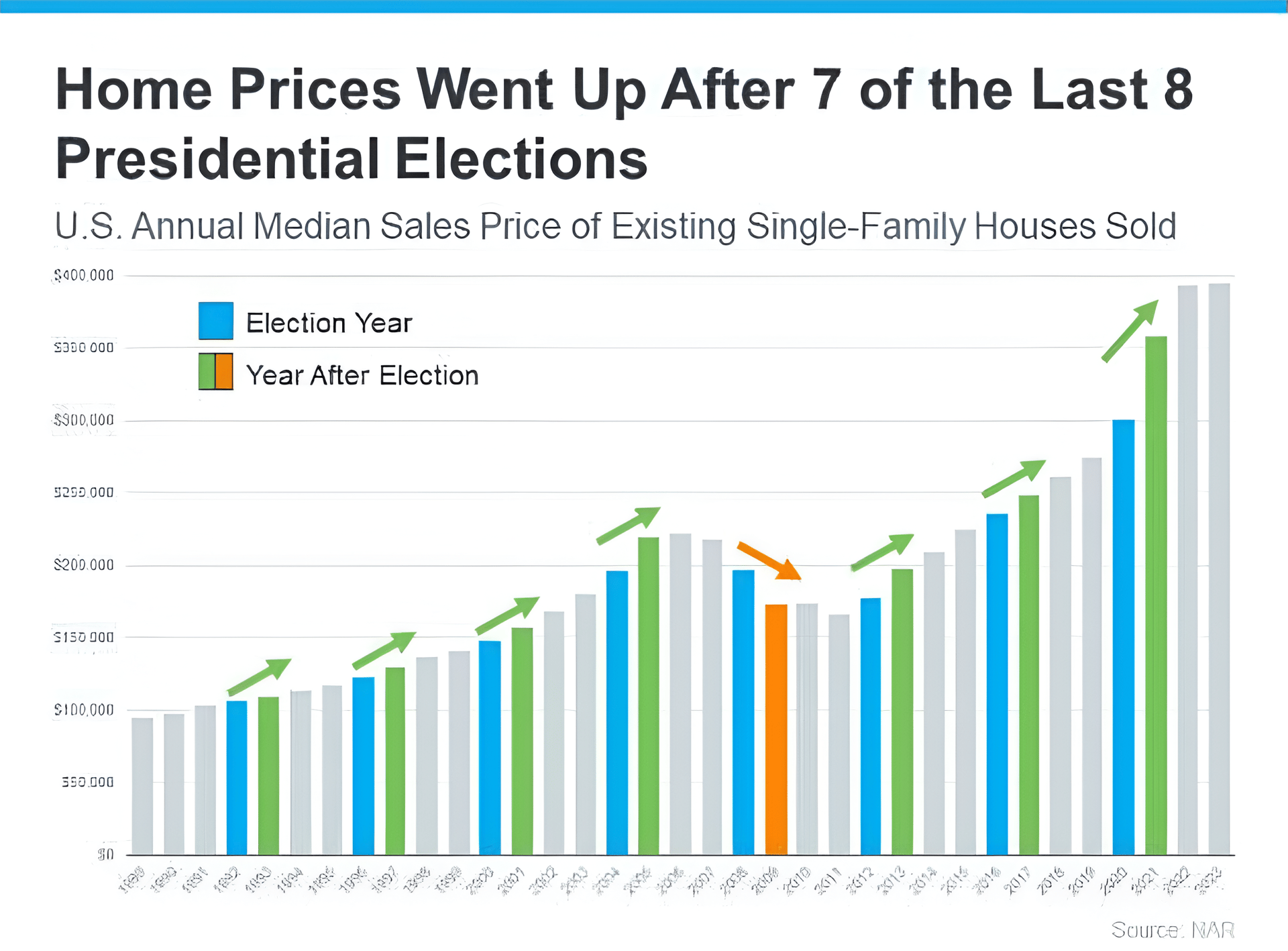 Home prices are pretty resilient. They generally rise year-over-year, regardless of elections. The latest data from NAR shows that after seven of the last eight Presidential elections, home prices increased