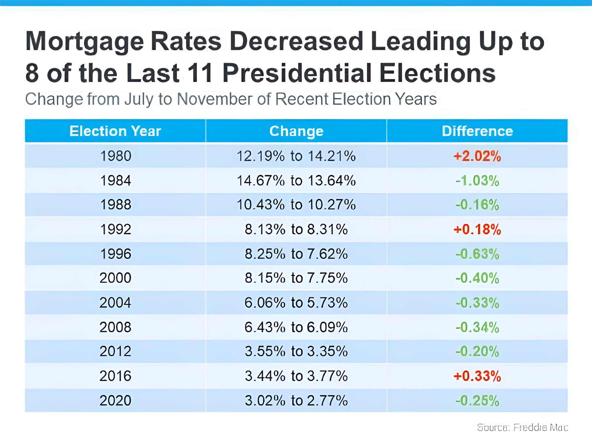 Mortgage rates are important because they affect how much your monthly payment will be when you buy a home. Looking at the last 11 Presidential election years, data from Freddie Mac shows mortgage rates decreased from July to November in eight of them (see chart below):
