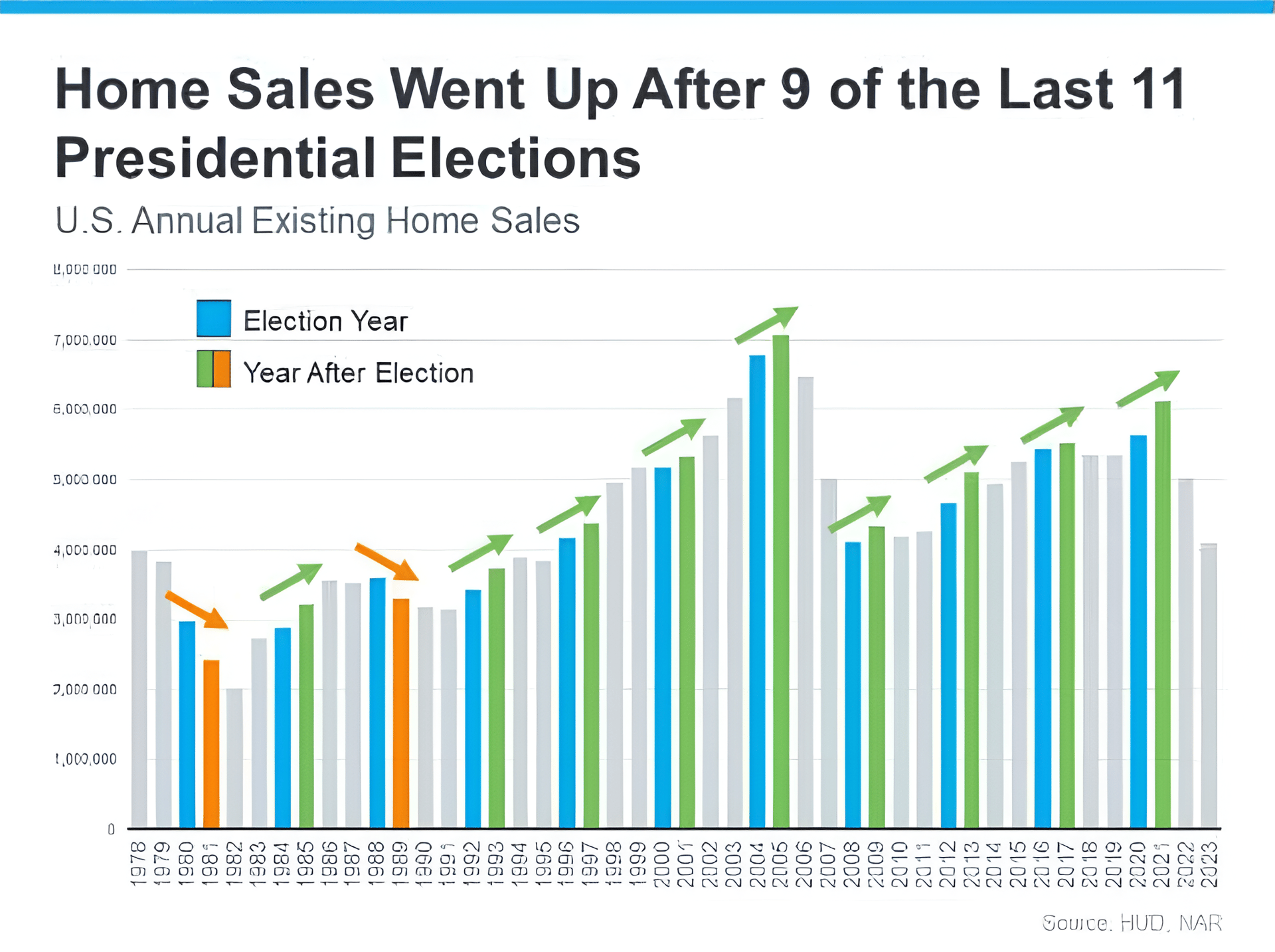 The graph shows annual home sales going back to 1978. Each year with a Presidential election is noted in blue. The year immediately after each election is green if existing home sales rose that year. The two orange bars represent the only years when home sales decreased after an election.