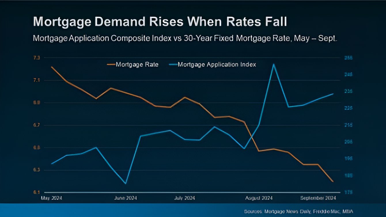 The graph below illustrates the relationship between falling mortgage rates and rising buyer activity. The orange line represents the average 30-year fixed mortgage rate, while the blue line shows the Mortgage Bankers Association (MBA) Mortgage Application Index, which tracks the number of mortgage applications.