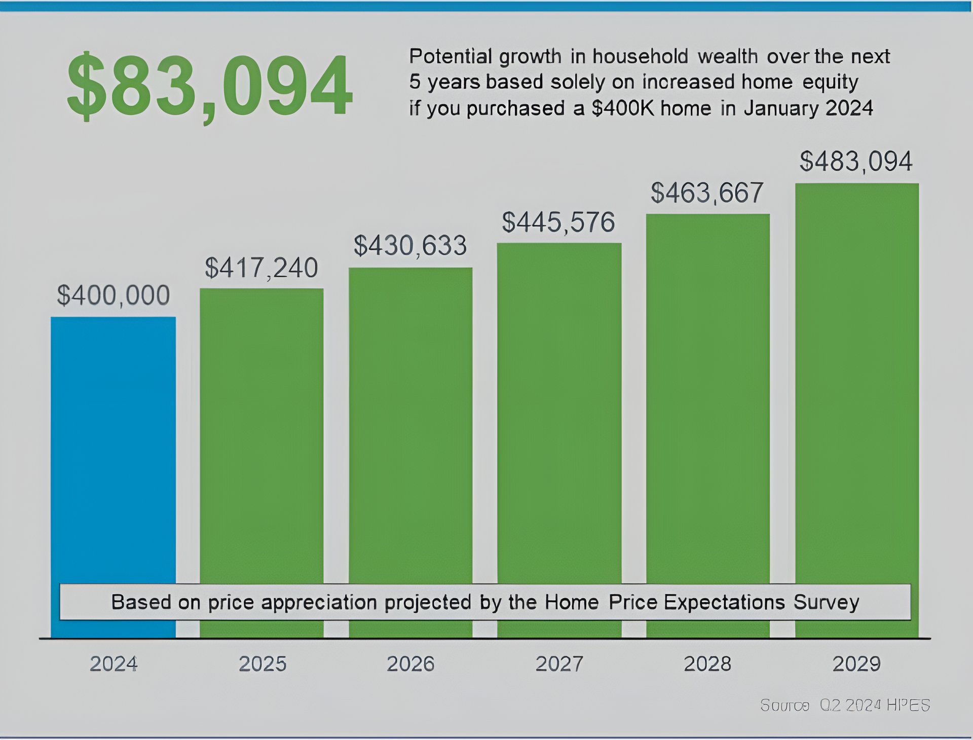 In this example, let's say you went ahead and bought a $400,000 home at the beginning of this year. Based on the expert forecasts from the HPES, you could gain more than $83,000 in household wealth over the next five years. That's not a small number