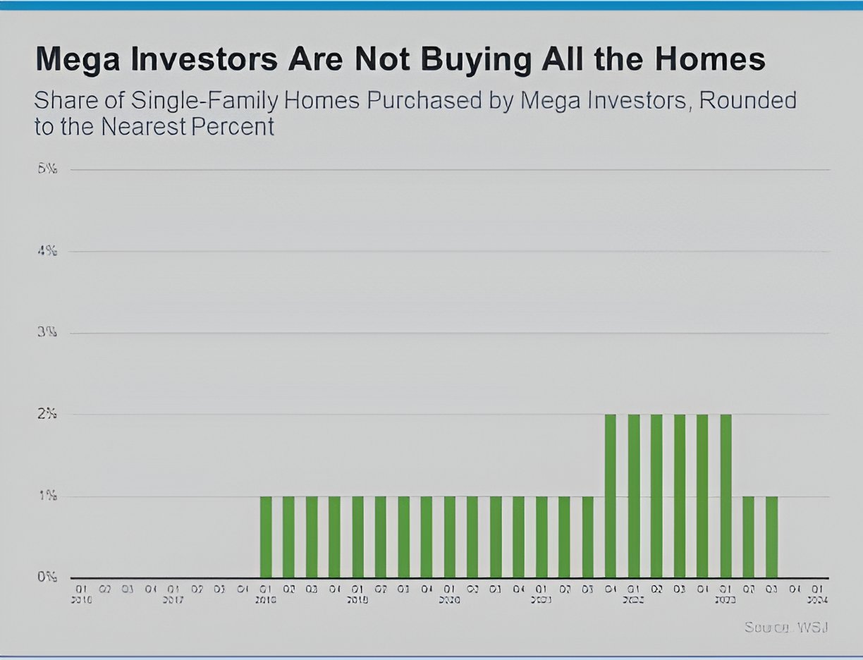 But let's focus on the giant, mega-investor firms since that's what is being talked about so frequently on social media right now. Mega investors are those who own 1,000÷ properties. You may be surprised to see that, according to the Wall Street Journal, they don't buy all that many homes (see graph below):