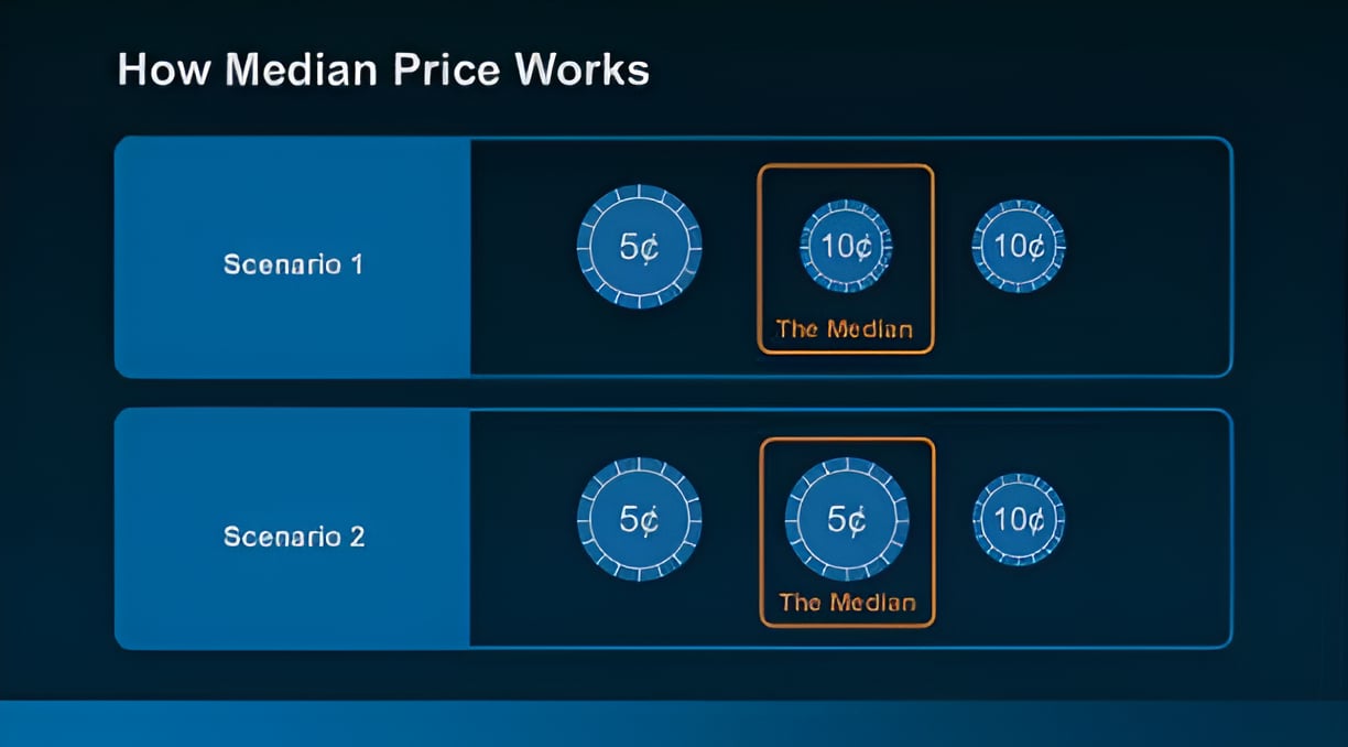 To show you how this works, here's a simple explanation of a median (see visual below). Let's say you have three coins in your pocket, and you decide to line them up according to their value from low to high. If you have one nickel and two dimes, the median (the middle one) is 10 cents. If you have two nickels and one dime, the median is now five cents.